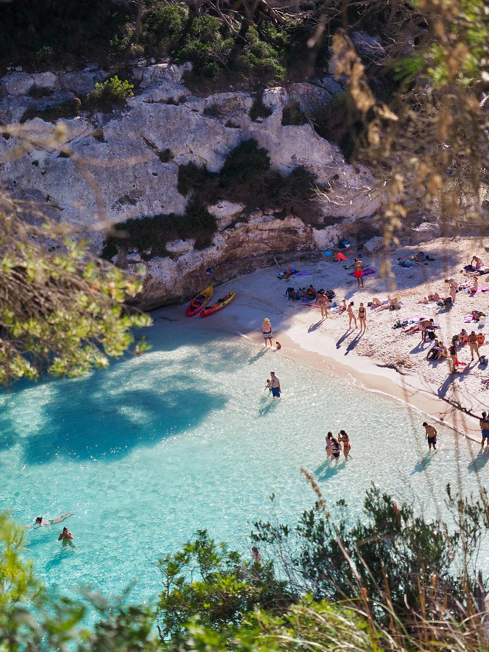 Cala Macarelleta, Menorca, Spain. Access by foot or water only. You turn the corner and it almost takes your breath away how sweet and charming this hidden bay is. The light rose sand swirling with the clearest water. Paradise.